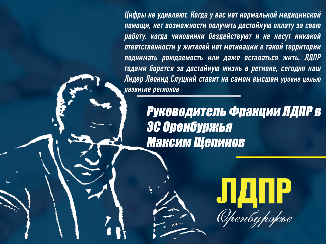 «Цифры не удивляют. Когда у вас нет нормальной медицинской помощи, нет возможности получить достойную оплату за свою работу, когда чиновники бездействуют и не несут никакой ответственности у жителей нет мотивации в такой территории поднимать рождаемость или даже оставаться жить. ЛДПР годами борется за достойную жизнь в регионе, сегодня наш Лидер Леонид Слуцкий ставит на самом высшем уровне целью развитие регионов. И это единственный выход для нас, потому что еще буквально несколько лет и в Оренбургской области просто некому будет жить и работать» - комментирует депутат от ЛДПР Максим Щепинов.