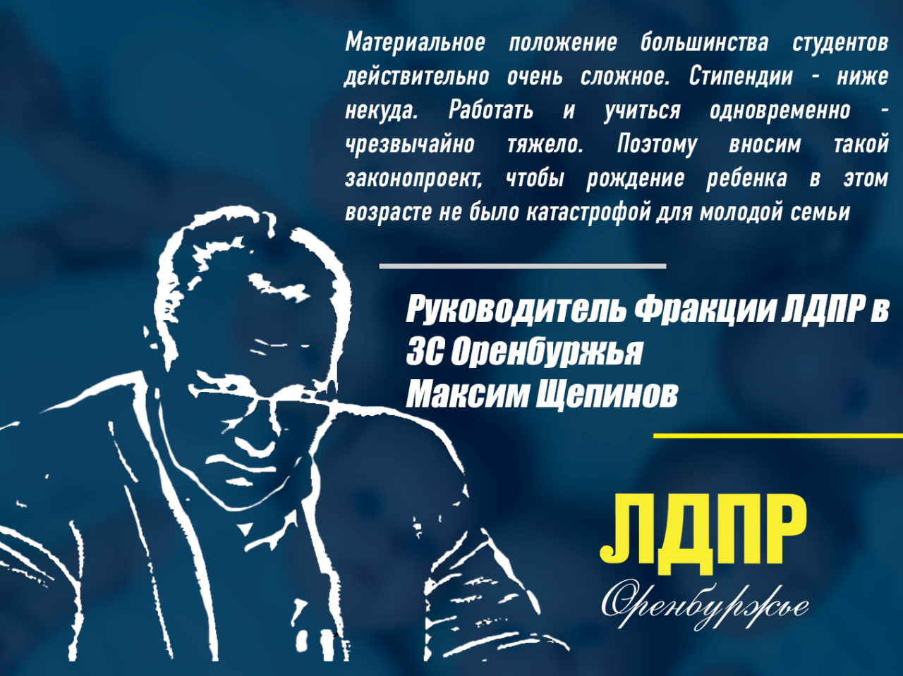 В ближайшее время руководитель фракции ЛДПР в Законодательном Собрании Оренбуржья Максим Щепинов представит законопроект, которым предлагается закрепить право студенток до 24 лет при рождении ребенка получить региональный материнский капитал размером в 100 тысяч рублей. Выплата должна подлежать индексации.