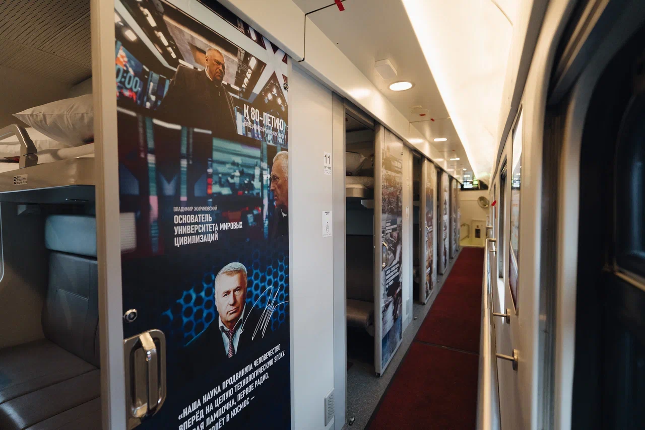 Тематический состав будет курсировать по маршрутам Москва — Адлер, Москва — Казань и Москва — Владивосток в течение всего 2026-го года. Мероприятие проходит в рамках проекта ЛДПР совместно с Фондом памяти и наследия Жириновского и АО «РЖД». Первых пассажиров встретил и сопроводил оркестр ОАО «РЖД» исполнивший любимые песни Основателя ЛДПР.
